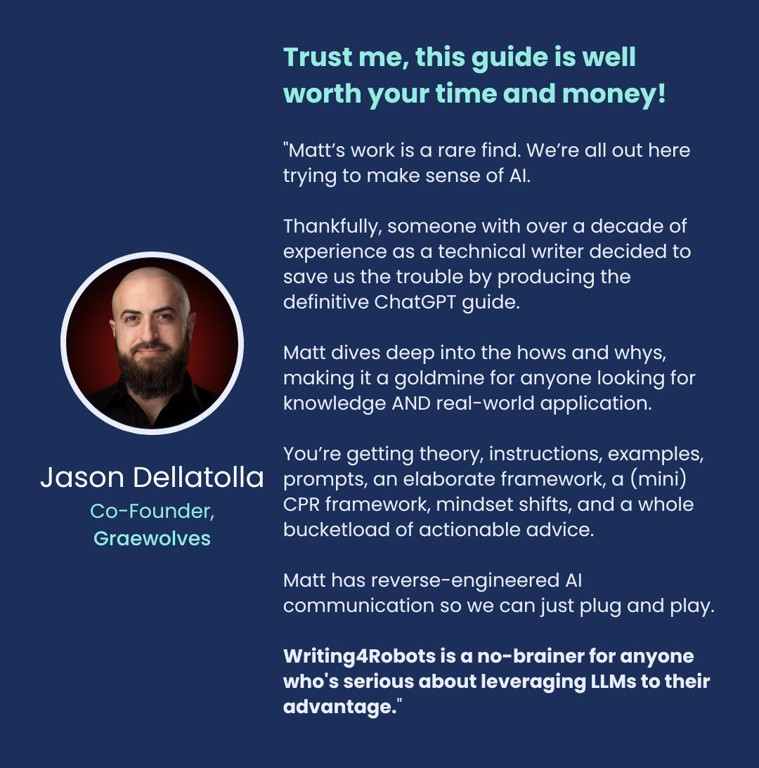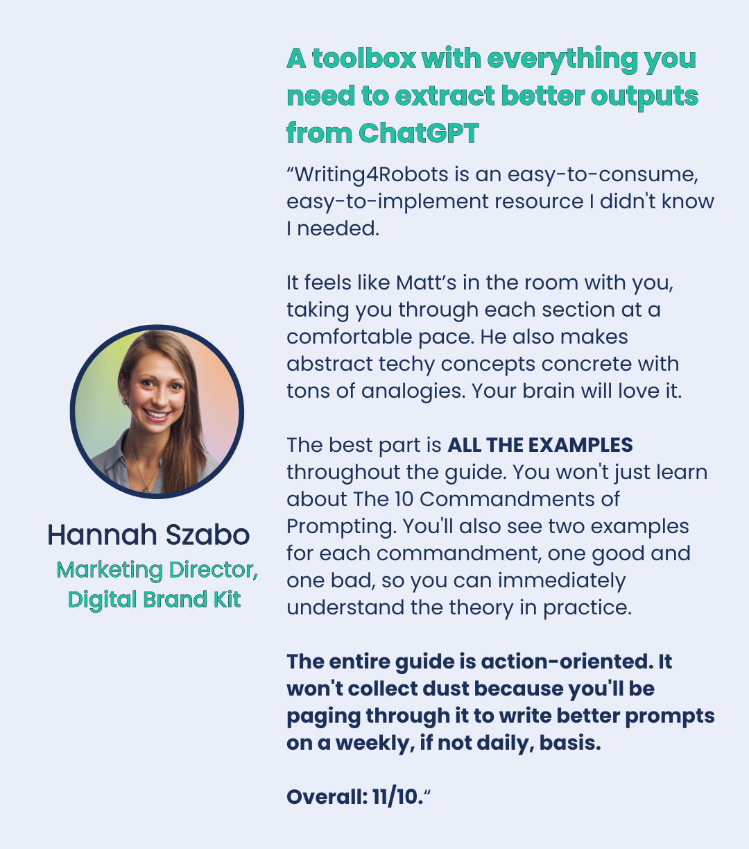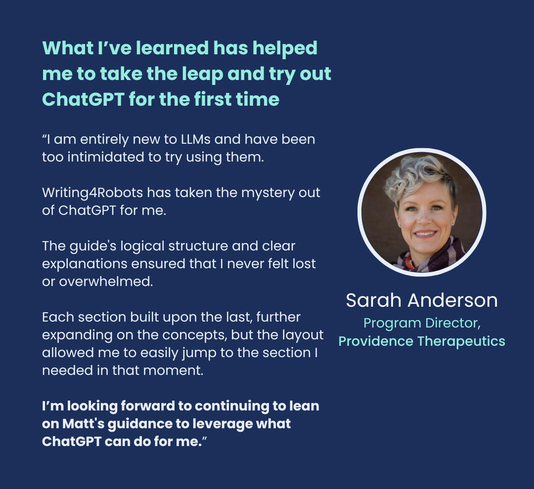 Writing4Robots doesn’t just teach you how to use ChatGPT—it shifts your mindset, so you understand how large language models work and the best ways to interact with them strategically.This cognitive shift sets you up for success working with AI long after you’ve finished the guide.