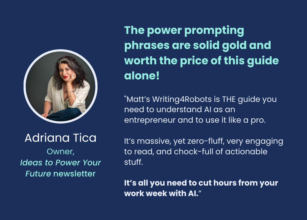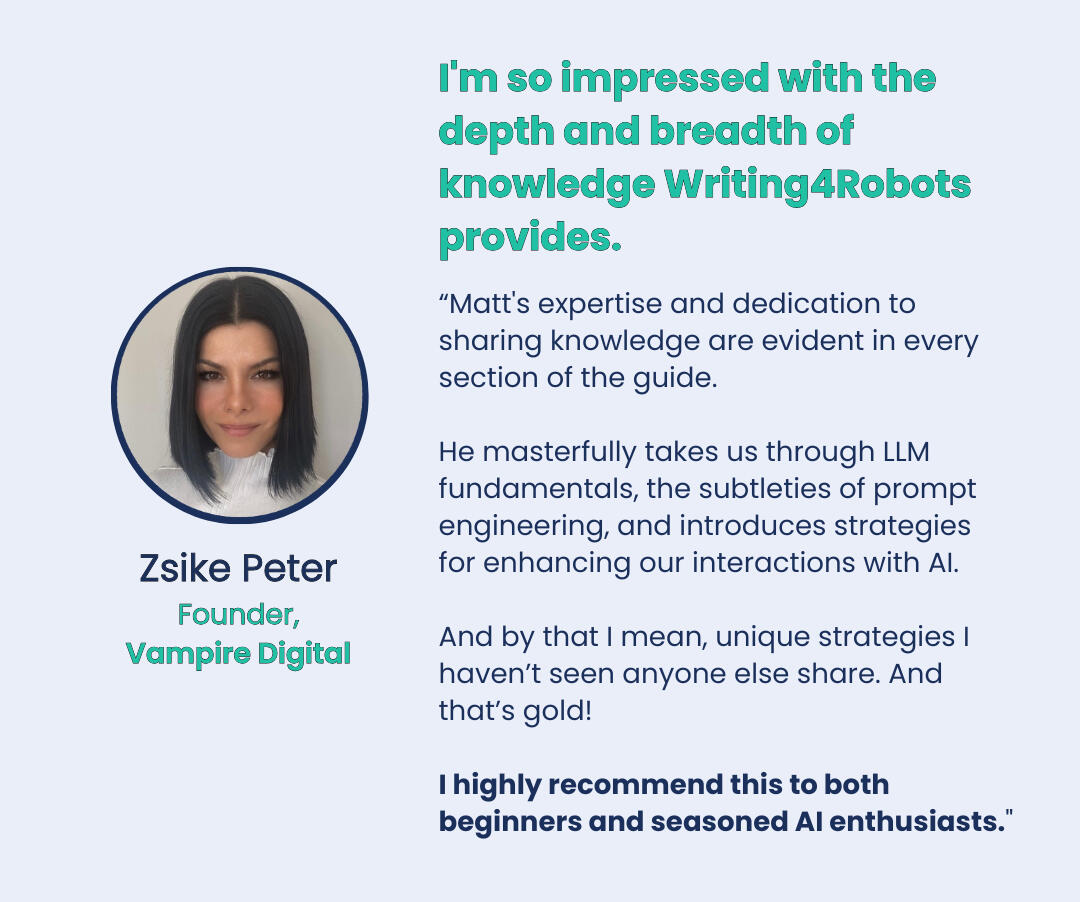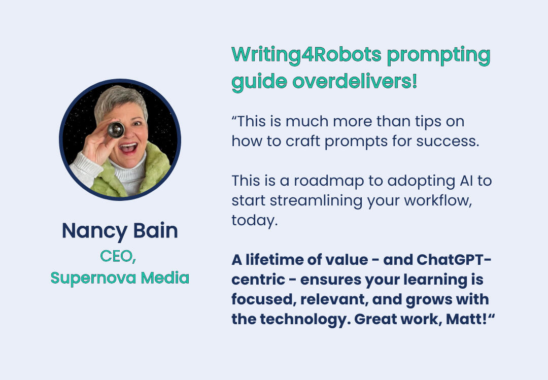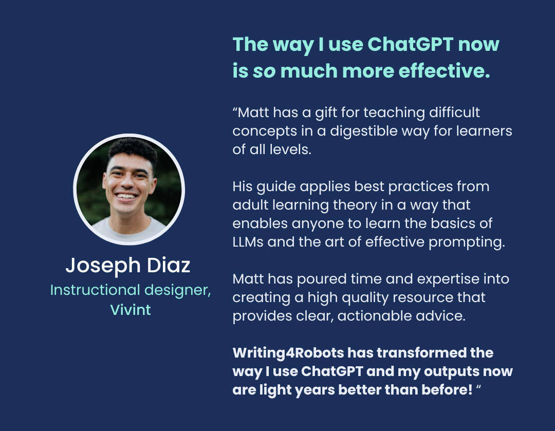 Writing4Robots doesn’t just teach you how to use ChatGPT—it shifts your mindset, so you understand how large language models work and the best ways to interact with them strategically.This cognitive shift sets you up for success working with AI long after you’ve finished the guide.